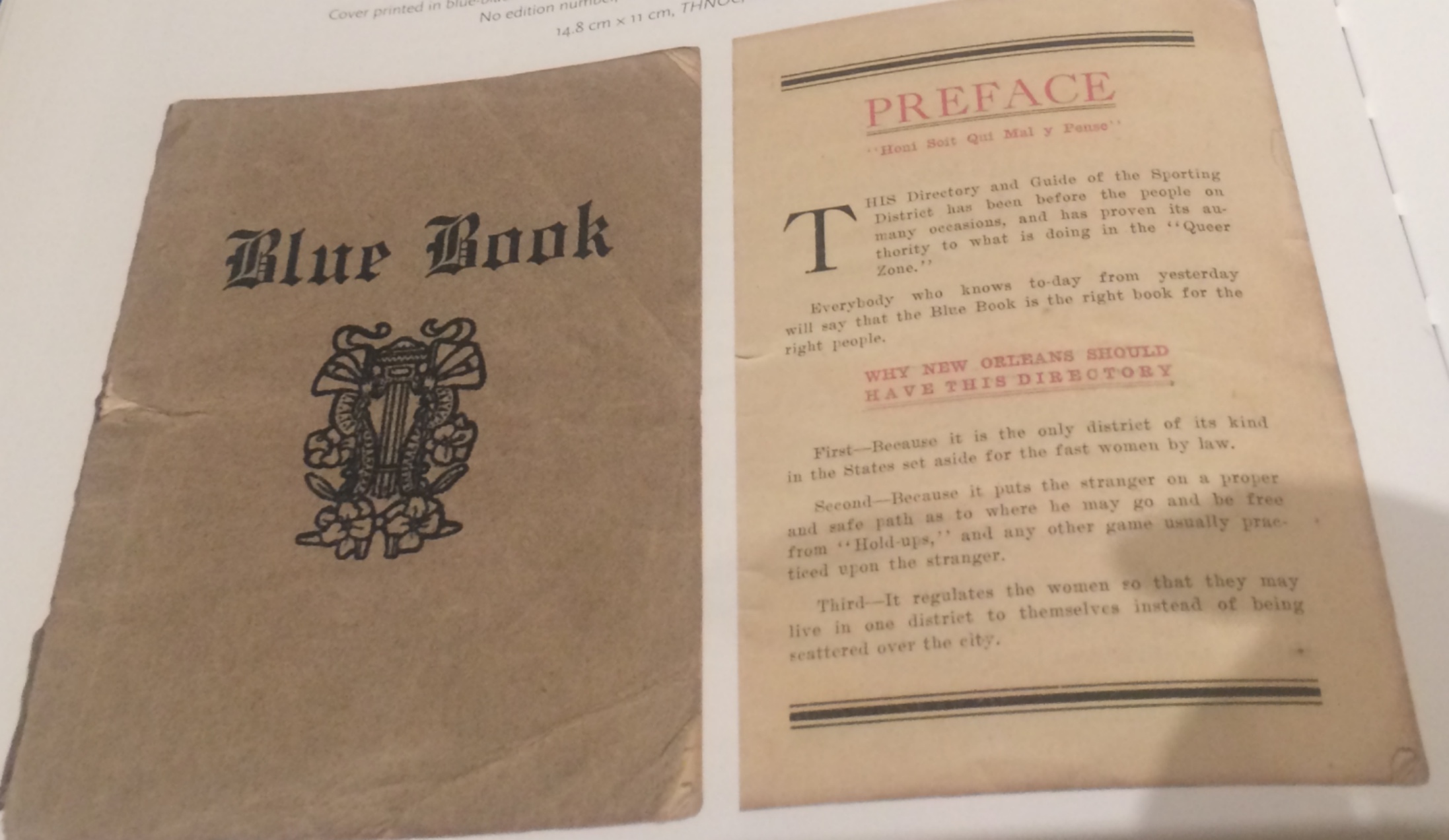 Prendiamo ad esempio Storyville e quello che facevano per promuovere le attività del quartiere. Gli avventori, di certo, non giravano sprovveduti per le strade perché veniva fornita loro un una vera e propria guida del piacere. Nella guida erano annotati nome, razza e indirizzo delle prostitute con tanto di pubblicità per acquistare prodotti di lusso o altre cose nella zona. Queste guide erano note a tutti come Blue Book (la più famosa), anche se non tutte riportavano lo stesso titolo (un po’ come succede con la crema di cioccolato che tutti, anche se non lo è, chiamiamo Nutella). Con questo termine infatti ci si riferiva anche per indicare pubblicazioni come: Hell- O, New Mahogany Hall e l’ossimorico Red Book.